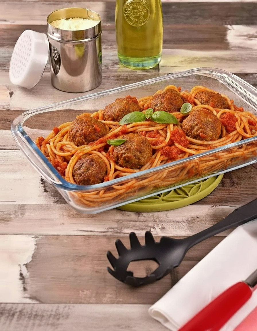Perfecta para gratinados, pasteles, carnes y vegetales. Su diseño transparente permite controlar la cocción y lucir tus platos directamente en la mesa.
