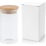 Hecho con vidrio resistente y madera natural, este recipiente es duradero y ecológico.