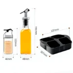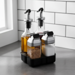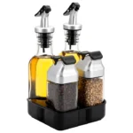 Este set elegante y funcional incluye frascos de vidrio con tapa de plástico que garantizan un vertido preciso y sin desperdicios, manteniendo la frescura de tus condimentos. Su base organizadora aporta orden y un toque decorativo, ideal para cocinas modernas y mesas bien presentadas.
