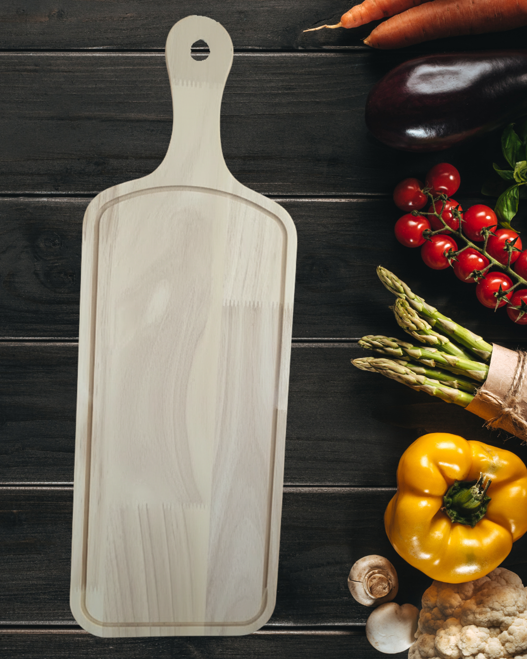 Eleva la presentación de tus platos con esta elegante tabla de madera natural, ideal para servir pizzas, frutas, quesos o aperitivos.