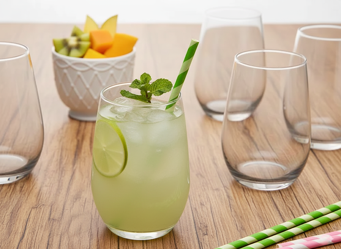 - Material: Fabricado en vidrio transparente de alta calidad, permite apreciar con claridad el contenido, lo que lo hace perfecto para bebidas coloridas como jugos naturales, cócteles o infusiones.